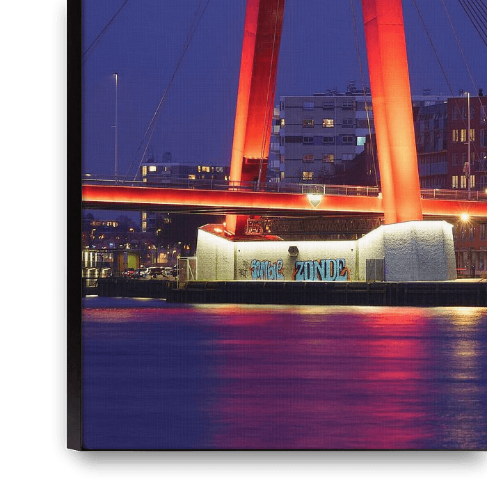 De rode Willemsbrug mooi verlicht tegen een diepblauwe lucht aan het begin van de avond.