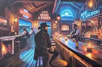 Verlichte bar scène in het Oude Westen in de wildernis bij nacht