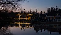 "Verlichte Windmolen bij Schemering" is een betoverend beeld dat de rustieke charme van een verlichte windmolen vastlegt tijdens de schemering. De windmolen, prachtig verlicht met sfeervolle lampjes, weerspiegelt schitterend in het kalme water van de gracht, waardoor een bijna symmetrisch beeld ontstaat. De omliggende huisjes, in typisch Nederlandse stijl, dragen bij aan de nostalgische en romantische sfeer van de scène.