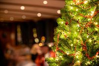 Mooi om te gebruiken als achtergrond, muur decoratie of bij styling van een kerst evenement. Sfeervolle interieur foto van kerstboom met versiering, kerstverlichting en een onscherpte achtergrond met eten of drinkende mensen.