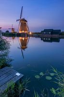 De molens van Kinderdijk worden één week per jaar, s'avonds uitgelicht. Deze foto is genomen tijdens het blauwe uurtje, waarbij je mooie pasteltinten in de lucht krijgt.