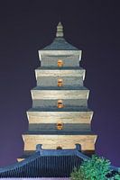 Verlichte oude 'Wild Goose' boeddhistische pagode tegen een gladde paarse hemel in Xian, China