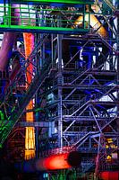 Deze foto toont de verlichte industriële architectuur van Landschaftspark Duisburg-Nord, een voormalige staalfabriek in het Duitse Ruhrgebied die is omgevormd tot een openbaar park. Het terrein, dat ooit deel uitmaakte van de Meiderich ijzerfabriek, combineert nu geschiedenis, kunst en technologie in een opvallend visueel schouwspel. s Nachts baden de enorme staalconstructies, trappen en pijpleidingen in kleurrijk licht - blauw, groen, rood en violet - ontworpen door kunstenaar Jonathan Park. De verlichting verandert de machines in een sculpturaal landschap en benadrukt de geometrie en complexiteit van de oude industriële structuur. Ik werd aangetrokken door het ritme van de metalen oppervlakken en het kleurenspel dat nieuw leven brengt in wat ooit een symbool van zware industrie was. Dit beeld viert het hergebruik van industrieel erfgoed en laat zien hoe techniek en kunst kunnen samensmelten om iets monumentaals en menselijks te creëren. De compositie nodigt kijkers uit om schoonheid te zien in staal, licht en structuur - een abstracte stad van herboren metaal.