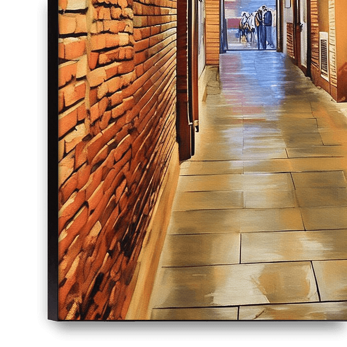 Deze foto toont een smalle, verlichte steeg met bakstenen muren en een tegelvloer in Toulouse, Frankrijk. Het steegje is bedekt met een houten plafond met zichtbare balken en TL-verlichting. Aan het einde van het steegje is een groep mensen te zien die in de verte staan, omlijst door een boog die uitkomt op een lichtere ruimte buiten.