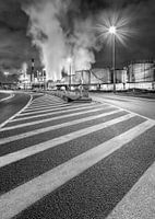Verlichte weg 's nachts met grafische markeringen en raffinaderij met grote rookpluimen op de achtergrond, Haven van Antwerpen