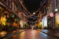 Amsterdam verlichte winkelstraat in de binnenstad bij nacht met kerstversieringen boven de Runstraat in het 9 straatjes winkelkwartier.