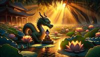 In het midden van een rustige tempeltuin, waar de lucht is doordrongen van stilte en verlichting, mediteert een jonge monnik op een lotusbloesem. Om hem heen zit een trotse draak wiens aanwezigheid zowel majestueus als beschermend is. Ze worden omringd door een vijver vol gloeiende lotusbloesems die als lantaarns op het wateroppervlak…