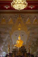 Te midden van de sublieme sfeer van Wat Suthiwararam in Bangkok staat de gouden Boeddha, een majestueuze belichaming van vrede en innerlijke harmonie. Zijn gezicht, dat wordt gekenmerkt door fijne details, gloeit in warm goud, dat met zachte elegantie samensmelt met de weerkaatsende lichtstralen in de kamer. Zijn gesloten ogen lijken de kijker uit te nodigen in een meditatieve stilte die het lawaai van de buitenwereld doet vervagen.