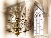 Een oud kerk interieur met eenvoudig venster. dit tezamen met en oude kaarsenkroon twee manieren om licht binnen te krijgen. verlichting is ook wat er in een kerk gebeurd.