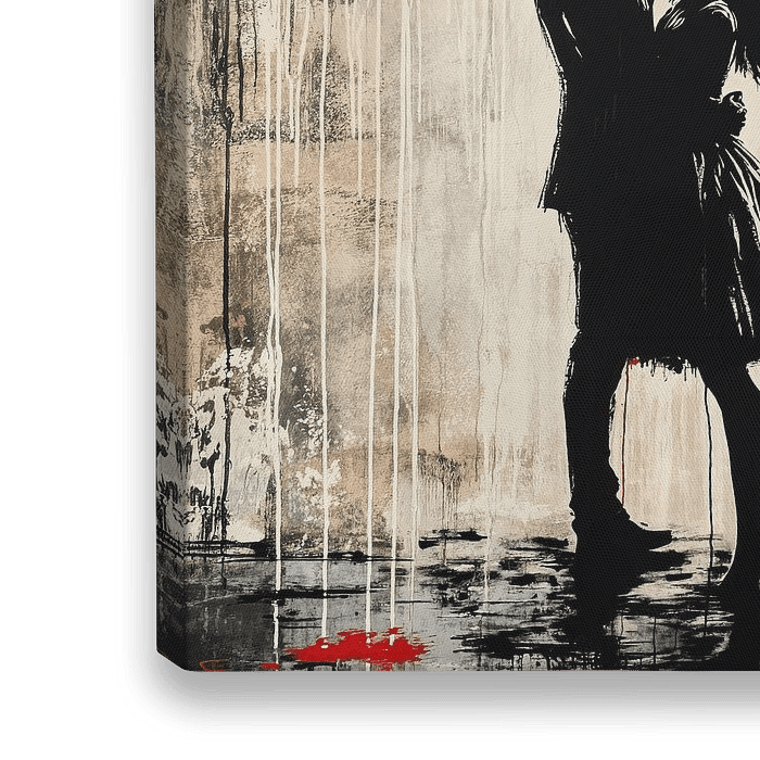 Verliefd Paar Onder Hart - Dit is een modern kunstwerk waarin een verliefd paar is afgebeeld dat elkaar kust onder een groot, druipend rood hart tegen een ruwe texturen achtergrond in tinten grijs en beige.