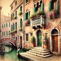 Een betoverende ochtend in Venetië, waar het licht zacht over de gevels strijkt en de bloemen uit de vensterbakken bijna over de rand hangen. Groen houten luiken sieren de verweerde muren en een gondel ligt stil aangemeerd aan de rand van het kabbelende water.