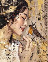 Een jonge vrouw met Aziatisch uiterlijk heeft een roodborstje op haar hand. Ze kijkt naar het diertje en de roodborst kijkt naar haar. Een kunstwerk dat de liefde tussen mens en dier visualiseert.