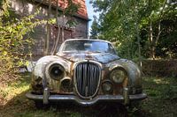 Dit is een foto van een oude en achtergelaten Jaguar. Hij staat in een tuin van een klein huisje ergens in België. Het huisje was nog vrijwel helemaal intact van binnen, op de stof en de spinnenwebben na.