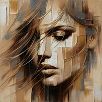 Een dromerig modern abstract olieverfportret van een vrouw met lang haar, gehuld in aardse tinten beige, bruin en goud. De zachte kleuren en vloeiende lijnen stralen een gevoel van warmte, elegantie en innerlijke rust uit. Het spel van licht en schaduw geeft het werk een bijna etherische diepte. De vrouw lijkt gevangen in een stil…