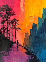 Het schilderij toont een berglandschap in impressionistische stijl, vol felle, verzadigde kleuren. Bergen rijzen op in vegen van blauw en paars, terwijl de lucht gloeit in roze en oranje. De penseelstreken zijn energiek en expressief, alsof het landschap beweegt. Tussen de kleurrijke vormen duikt een donker silhouet op — een eenzame…