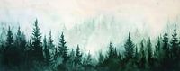 Dit aquarelkunstwerk toont een uitgestrekt dennenbos, gehuld in een laag van zachte nevel en lichte mist.