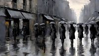 Een groep kleurloze, vormloze figuren doorkruist een winkelstraat, gehuld in de eeuwige neerslachtigheid van de regen. Hun silhouetten worden nauwelijks gedefinieerd in het diffuus licht, waardoor ze lijken op schimmen die verloren dwalen in een wereld zonder hoop. Ieder van hen draagt een paraplu als een nutteloos schild tegen de constante neerslag die als een symbool van hun onophoudelijke tegenspoed lijkt te fungeren.
