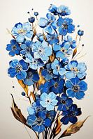 De bloemen stralen een nostalgische charme uit, als vergeten herinneringen op een vergeelde pagina. De kunstzinnige tekenstijl vangt de tijdloze delicatesse van de bloemen en creëert een sfeer van vervlogen betovering. De blauwe bloemen lijken te zweven op het oude papier, als gedroomde vergeet-me-nietjes uit een andere tijd.