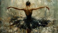 Ze draagt een zwarte tutu, die met krachtige, expressieve penseelstreken is weergegeven, bijna alsof de verf spat van de bewegingen die ze maakt. De ballerina staat centraal, met haar armen wijd uitgestrekt, klaar om in een nieuwe beweging over te gaan. De achtergrond is chaotisch en abstract, met een mix van grijze, bruine en blauwachtige tinten, wat de focus op haar fragiele maar krachtige figuur versterkt. Het contrast tussen de donkere tutu en de lichte huid van de ballerina creëert een visuele spanning die de aandacht van de kijker vasthoudt.