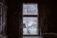 Vuil raam en interieur in de eetzaal van een verlaten hotel in Duitsland.