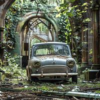 Dit fascinerende beeld toont een vergeten Mini Cooper die rust in een verlaten gotische ruïne die overwoekerd is door de natuur. De kleine cultusauto, ooit een symbool van stedelijke mobiliteit, is nu bedekt met een dikke laag stof en roest, terwijl mos en vegetatie zich langzaam een weg banen. Op de achtergrond rijzen indrukwekkende stenen bogen en delicate smeedijzeren poorten op, overwoekerd door dichte klimop en wijnranken, die de scène een sprookjesachtige maar melancholische uitstraling geven. Het licht dat door het bladerdak valt, benadrukt de texturen van het verval en creëert een scène waarin de tijd lijkt stil te staan en de natuur de overhand heeft gekregen.