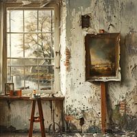 Een vervallen atelier waar de tijd lijkt te hebben stilgestaan. Het licht valt zacht door het grote raam en verlicht een tafereel vol contrasten: afbrokkelend pleisterwerk, zichtbare bakstenen en een oud schilderij dat eruitziet als een venster naar een andere wereld. Buiten wordt een vredige rivier weerspiegeld, terwijl binnen…