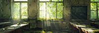 In "Green Lessons" ontdekken we een verlaten schoolomgeving die voorzichtig is teruggewonnen door de natuur. De scène wordt overspoeld met zacht, groen licht dat door grote ramen naar binnen valt en het klaslokaal in een levende wereld verandert. Jonge scheuten en planten bedekken de schoolbanken en roepen een sfeer op van hoop en…