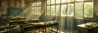 In "Green Lessons" ontdekken we een verlaten schoolomgeving die voorzichtig is teruggewonnen door de natuur. De scène wordt overspoeld met zacht, groen licht dat door grote ramen naar binnen valt en het klaslokaal in een levende wereld verandert. Jonge scheuten en planten bedekken de schoolbanken en roepen een sfeer op van hoop en…
