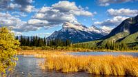 De 'Vermilion Lakes' liggen bij Banff, Alberta, Canada. Ze zijn onderdeel van het Banff national Park dat in de Canadese Rocky Mountains ligt. De meren worden gevormd door de Bow river die door het dal stroomt. Op de achtergrond zien Mount Rundle.