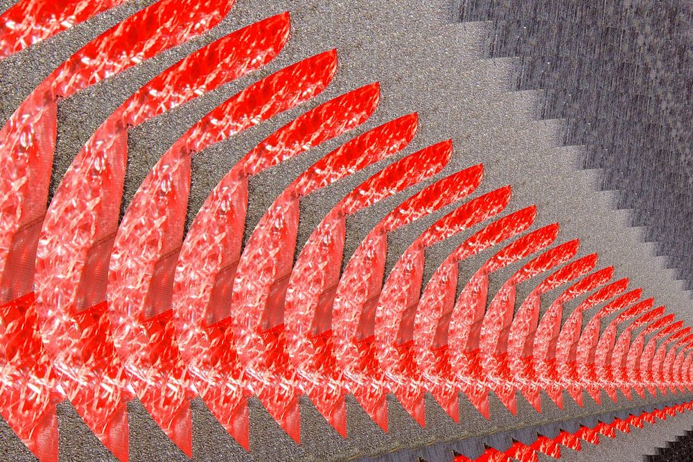 Het beeld is grijs, met vluchtlijnen en sterk rood.