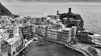 Een zwart-wit foto van Vernazza, een stad en een gemeente in de provincie La Spezia, Ligurië, Noordwest-Italië. Het is een van de vijf steden in de regio Cinque Terre.