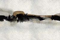 Abstract landschapspanorama met neutrale kleurtonen. Enkele fijne zwarte lijnen maken de compositie wat losser, zwarte penseelstreken geven het beeld kracht.