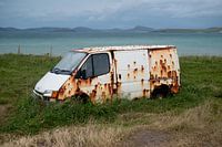 Verroeste witte Ford Transit in weiland op het Schotse eiland Barra. In de achtergrond zee en bergen. Einde van de reis van deze bus... Of gaat het avontuur verder bij jou aan de wand?