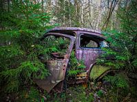 Prachtig urbex achtige foto. Verlaten auto, compleet overwoekerd door begroeiing. Heerlijke kleuren in dit bijzondere tafereel.