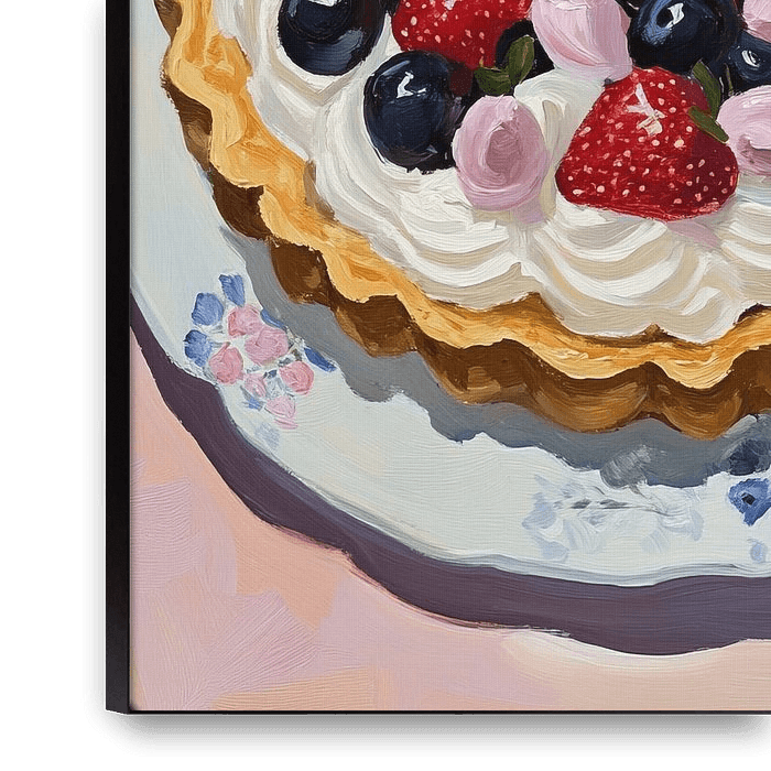 Vers Fruit op Romige Taart - Dit fruitgebak schilderij toont een kleurrijke taart rijk belegd met verse aardbeien, blauwe bessen en romige toefjes op een schitterend gedecoreerde schotel omgeven door zachte pastelkleuren.