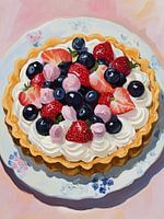 Vers Fruit op Romige Taart - Dit fruitgebak schilderij toont een kleurrijke taart rijk belegd met verse aardbeien, blauwe bessen en romige toefjes op een schitterend gedecoreerde schotel omgeven door zachte pastelkleuren.