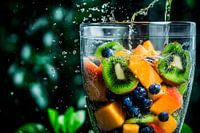 Levenslust in vloeibare vorm: sappige stukjes kiwi, mango en bosbessen bruisen verfrissend in een glas, terwijl de vloeistof spettert en de indruk geeft van genot en vitaliteit. Dit levendige tafereel is perfect voor de keuken of eetkamer en voegt een dynamische en gezonde flair toe aan elke kamer.