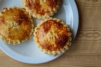Flat lay-weergave van een wit bord met versgebakken 'Mattentaarten' een gastronomische specialiteit uit de streek van Geraardsbergen in België. Hier vastgelegd op een rustieke houten tafel, die past bij elk keukeninterieur.