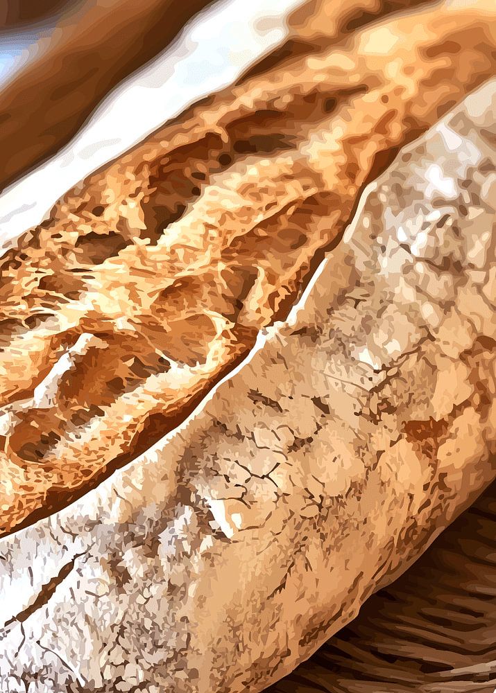 Op de foto zie je een versgebakken boerenbrood met een goudbruine, knapperige korst en een rustieke uitstraling. Het oppervlak van het brood is licht met bloem bestrooid, terwijl de diepe scheuren een hint geven naar de pluizige, zachte kruimel binnenin. Het ligt in een geweven mand op een doek, wat een warme en uitnodigende sfeer creëert. Op de achtergrond zijn licht vervaagde sneetjes brood te zien op een houten plank, wat de rustieke en zelfgemaakte esthetiek van het beeld benadrukt.