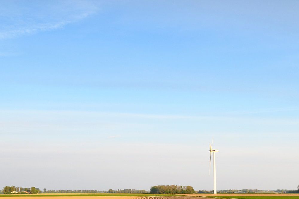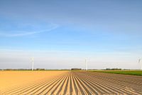 Vers geploegd aardappelveld met recht lijnpatroon en afnemend perspectief in Flevoland tijdens een mooie lentedag. Een rij windturbines staat links aan de horizon.
