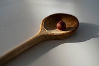 Verse hazelnoot welke ligt te drogen op een pollepel. Geraapt in Noord Brabant bij een natuurlijk bos, waar heel veel hazelaars bij elkaar staan. Onbespoten hazelnoot, puur natuur.
