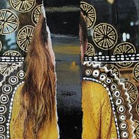 Deze collage is onderdeel van mijn art journal. Op speelse wijze ben ik met tijdschriften, acrylverf en stiften aan de gang gegaan. Hier zien we een vrouw afgebeeld, maar waarbij het gezicht is weggescheurd in een speelse strook van boven naar beneden. De detailleringen die wellicht doen denken aan de gouden details van Gustav Klimt…