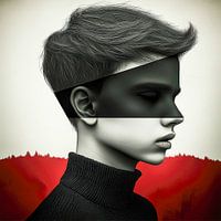 Op de achtergrond herkennen we een bos dat baadt in rode mist en dreigend en mysterieus overkomt. Dit decor versterkt het idee van onzekerheid en innerlijke onrust. De uitdrukking van de jonge hoofdpersoon is onbeweeglijk, bijna blanco, wat het gevoel versterkt dat hij gevangen zit in een staat van onwetendheid of desoriëntatie. De rode elementen op de achtergrond zouden kunnen wijzen op innerlijke onrust of onderdrukte emoties. Het beeld speelt met de dualiteit van licht en duisternis, bewustzijn en onderbewustzijn, en nodigt de kijker uit om zich bezig te houden met de verborgen delen van het zelf.
