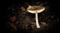 Dit is volgens mij een een beukenwortelzwam. Die staat normaal aan de stam van beuken, maar deze stond in het karkas van een dode boom die zo ver heen was dat ik die niet eens meer goed kon herkennen. Deze paddenstoel stond in een spleetje, een spelonk van dat karkas. Daar viel net de zon op, zodat de donkere achtergrond donker bleef en…