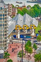 Centraal in dit schilderachtige beeld staan de beroemde Rotterdamse Kubuswoningen, ook wel het Blaakse Bos genoemd, in de jaren tachtig ontworpen door architect Piet Blom. Links zien we woontoren het Potlood en op de achtergrond een stukje van de Apenrots, beide eveneens ontworpen door Blom. Geheel rechts is nog een stukje van station…