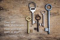 Verschillende sleutels op een rustieke houten plank, concept voor integratie van immigranten en vluchtelingen, voorbeeldtekst Ze zien er allemaal verschillend uit Ze kunnen allemaal een deur openen.
