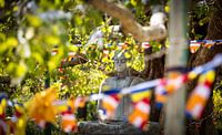 Beeld van Buddha verscholen tussen struiken en bomen met vaag zichtbaar vlaggetjes aan lijnen.