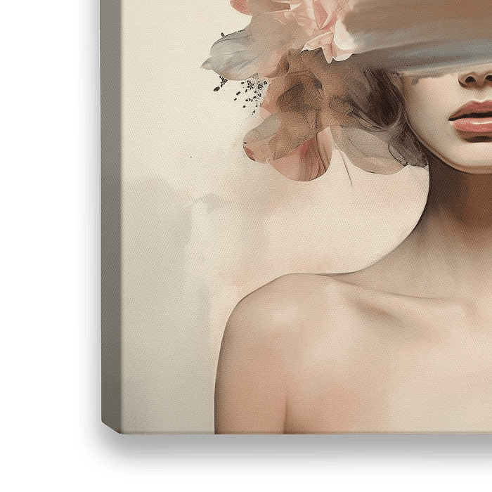 Portret van een mooie vrouw met prachtige bloemen in het haar in roze, bruin en grijstinten in haar haar. Naturel en pastel. Romantich, lichte pasteltinten en aardetinten. Verfijnd en subliem. Puur en verscholen in onschuld. Roos, klaproos. Vervaagd. Modern Abstract. Passend bij diverse stijlen en trends. Peach fuzz.