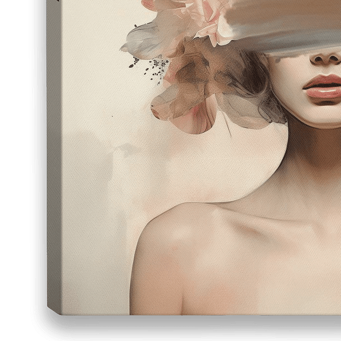 Portret van een mooie vrouw met prachtige bloemen in het haar in roze, bruin en grijstinten in haar haar. Naturel en pastel. Romantich, lichte pasteltinten en aardetinten. Verfijnd en subliem. Puur en verscholen in onschuld. Roos, klaproos. Vervaagd. Modern Abstract. Passend bij diverse stijlen en trends. Peach fuzz.