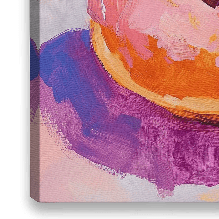 Verse Donuts - Dit kleurrijke schilderij toont twee levendig oranje donuts met glazuur, geaccentueerd door sterke roze en paarse tinten tegen een zachtroze achtergrond, geschilderd in een dikke, expressieve verfstijl.